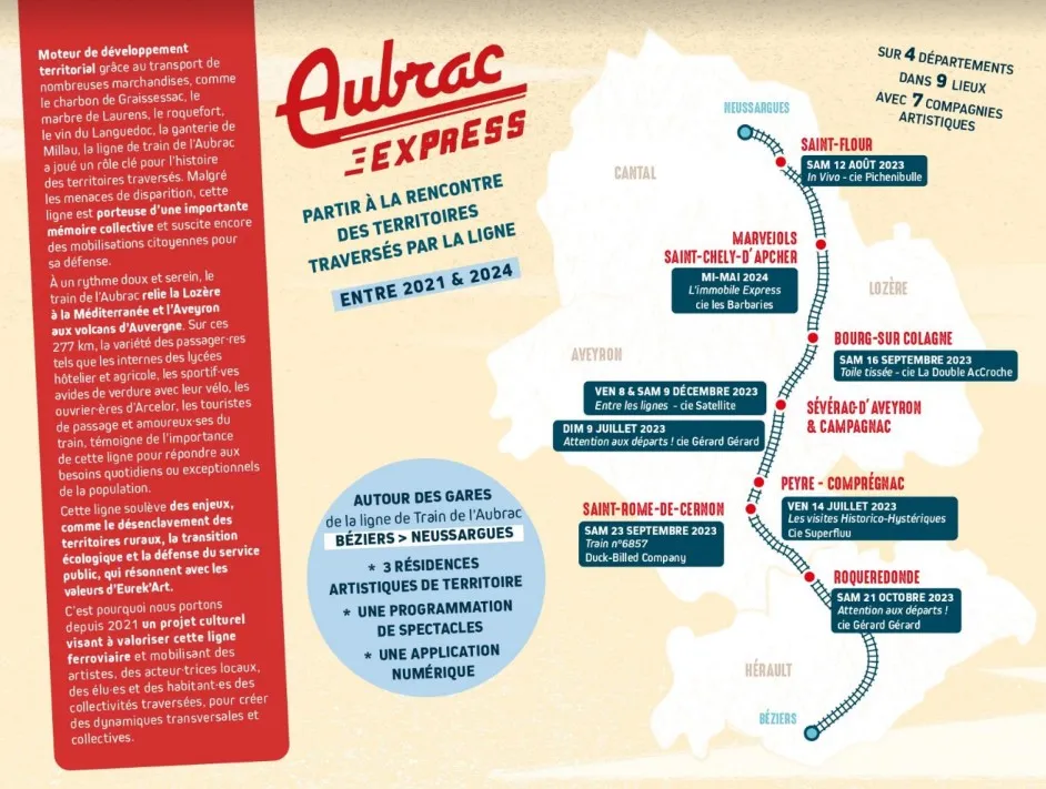 Pour rendre hommage à la ligne de train et à ses gares, Eurek'Art organise dans ce cadre une programmation de spectacles in situ le long de la ligne de l'Aubrac. Sept compagnies d'arts de la rue ont été invitées à recréer des performances artistiques qui s'étendent sur les quatre départements traversés entre juillet 2023 et mai 2024, offrant une expérience immersive aux spectateurs.
