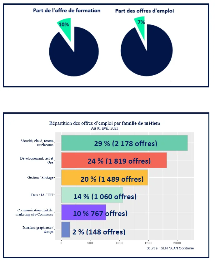 Selon les derniers chiffres publiés par l'observatoire des besoins en compétences et de l'offre de formation au numérique en France, GEN_SCAN, l'Occitanie se positionne comme la troisième région numérique de France avec 7 % des offres d'emploi et 10 % des formations numériques.