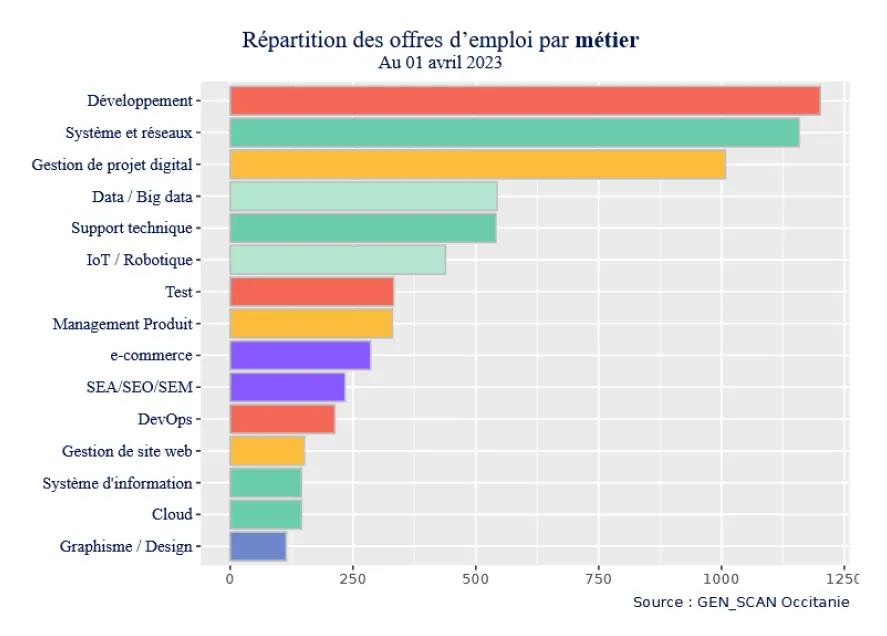 Les métiers de développeurs sont les plus recherchés actuellement en Occitanie, représentant 29 % des offres d'emploi, suivis par les métiers de "l'infrastructure, réseau" (24 %) et ceux du "digital marketing" (20 %). Les entreprises se tournent vers des profils plus experts, préférant désormais les profils "bac + 3", ou avec expérience, aux "bac + 2" tout juste diplômés.