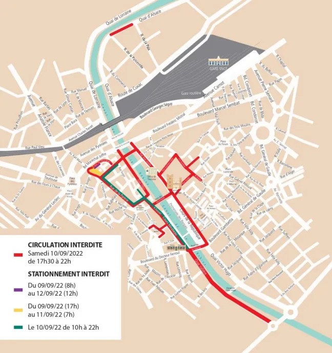 Côté circulation et stationnement, la ville met en place quelques modifications, et demande aux riverains de prendre leurs dispositions avant le déroulement de l’événement. « De 17h30 à 22h, certains axes du cœur de ville seront fermés à la circulation, notamment : le quai Vallière, le pont de la Liberté, le quai Dillon, la place de l’Hôtel-de-Ville, le cours de la République, le cours Mirabeau, la rue Voltaire, la rue Jean-Jaurès, etc. Le stationnement sera également interdit rue de l’Ancienne Porte de Perpignan (du 9 septembre à 8h au 12 à 12h), place Voltaire (du 9 septembre à 17h au 11 à 7h) et rue Voltaire, rue de la Parerie, rue Raspail et cours Mirabeau (le 10 septembre de 10h à 22h) » précise le communiqué de la ville de Narbonne.