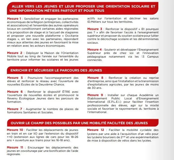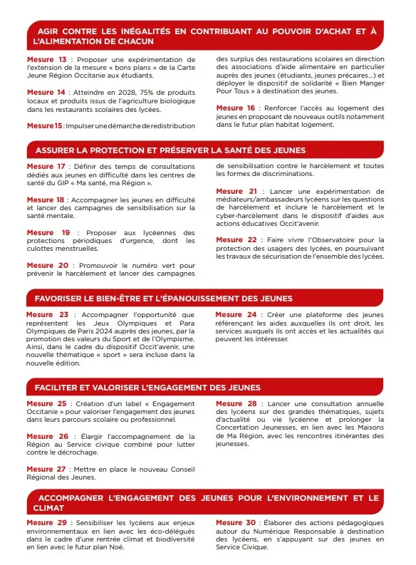 Un nouveau plan pour la jeunesse d’Occitanie. Pour apporter des solutions et des réponses aux problématiques des jeunes de la région, la région Occitanie, Carole Delga en tête, annonce la mise en place d’un plan de 30 mesures destinées à répondre aux attentes et besoins quotidiens exprimés par les jeunes eux-mêmes. En effet, le nouveau plan jeunesses et les 30 propositions qu’il regroupe sont intégralement issues des propositions de plus de 1600 jeunes et 75 structures d’accompagnements, consultés à l’occasion d’une grande concertation, lancée en juin 2022.