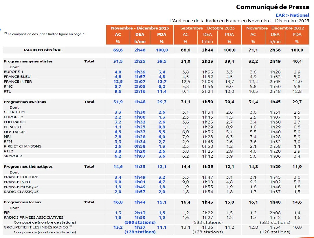 Les derniers chiffres de Médiamétrie révèlent une audience de la radio en France métropolitaine toujours aussi robuste. Les statistiques de la période du 30 octobre au 22 décembre 2023, recueillies auprès de 24 004 personnes âgées de 13 ans et plus, montrent une audience quotidienne de 38,7 millions d’auditeurs, écoutant la radio en moyenne 2h46 par jour.