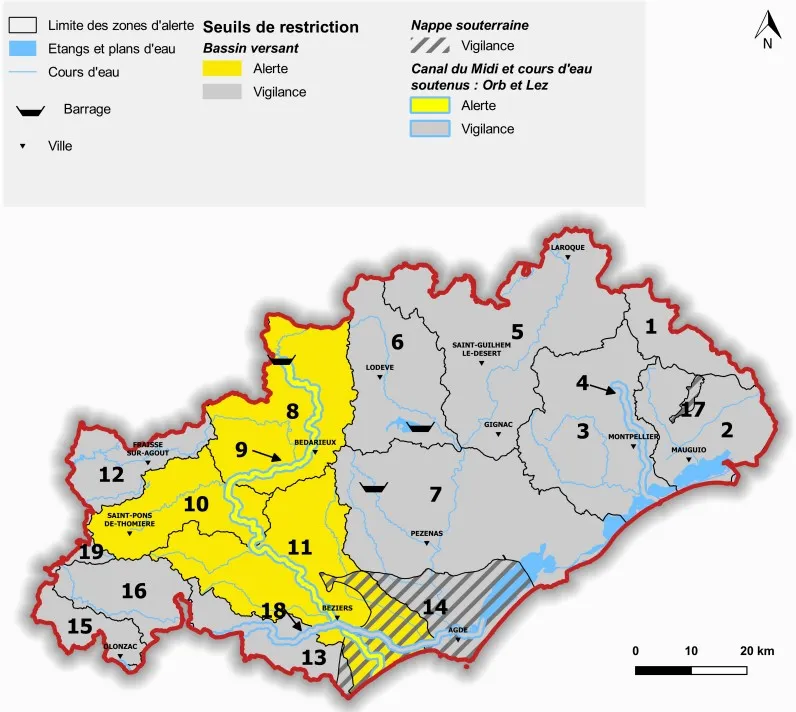 Sur ces zones, qui incluent les villes de Béziers, Bédarieux et Saint-Pons-de-Thomières (voir carte ci-dessous), le remplissage des piscines privées et le lavage des véhicules (en-dehors des stations professionnelles) sont interdits jusqu’à nouvel ordre. Le reste du département, placé en vigilance, n’est pas concerné par ces restrictions.