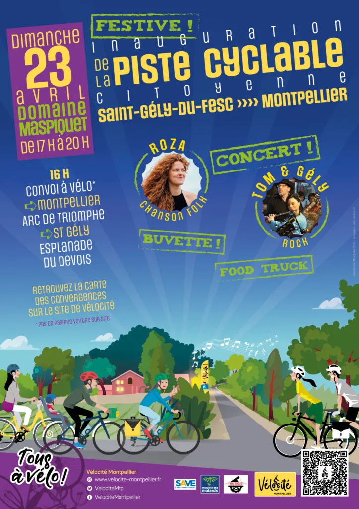 Au programme de cette fin d’après-midi : des convergences à vélo depuis Montpellier, Saint-Gély-du-Fesc et les communes alentour pour rejoindre le Domaine Maspiquet où se tiendront deux concerts: la chanteuse belge Roza, qui passe dans la région dans le cadre de son tour de France à vélo électrique solaire, et le groupe Tom & Gély , qui reprendra tout en rock des reprises de chansons célèbres. Une buvette et un food-truck permettront de se rafraîchir et de se restaurer sur place. C’est de 17h à 20h. Goûter, apéro, dîner sorti du sac pour ceux qui veulent rester un peu plus.